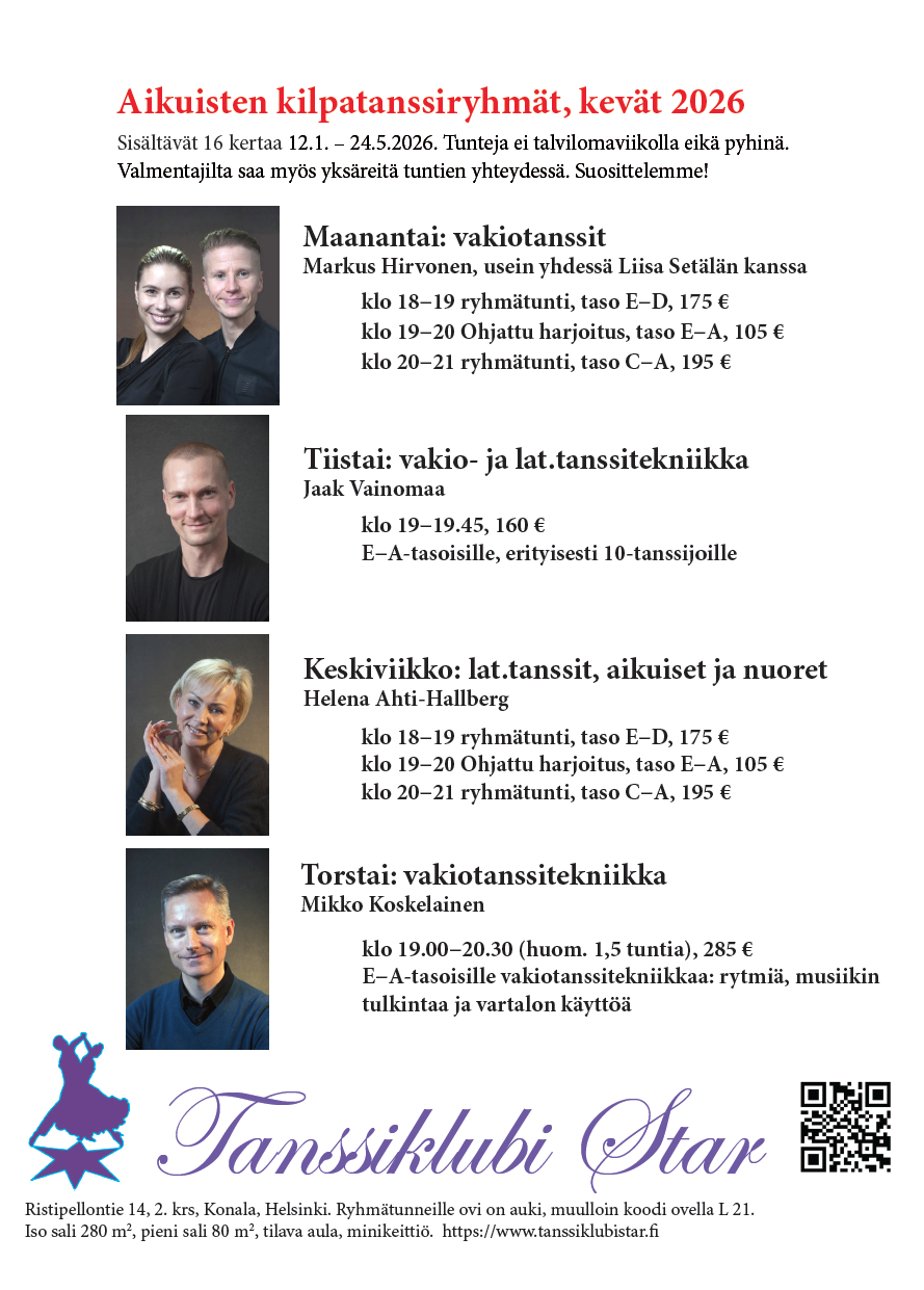 Starin vakiotanssiryhmät maanantaisin, valmentaja Markku Hirvonen, usein yhdessä parinsa Liisa Setälän kanssa. Tiistaisin vakio- ja latinalaistanssitekniikkaa vuoroviikoin, valmentaja Jaak Vainomaa. Latinalaistanssitryhmät keskiviikkoisin, valmentaja Helena Ahti-Hallberg. Torstaisin vakiotanssitekniikkaa valmentajana Mikko Koskelaisen (1,5h). Aikuisten kilpatanssiryhmät sopivat myös nuorille kilpailijoille, tervetuloa mukaan!
