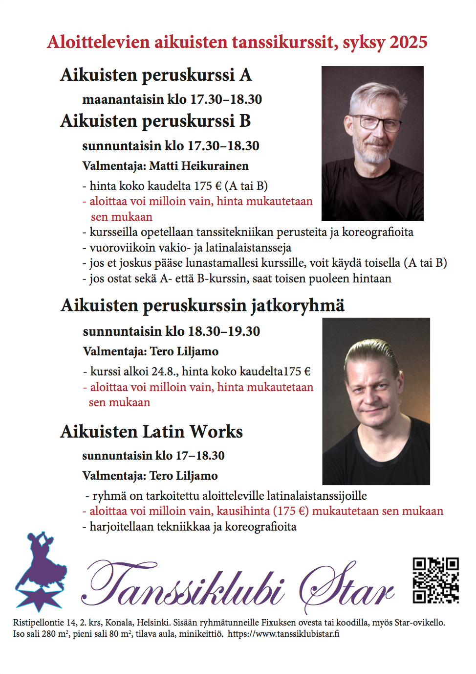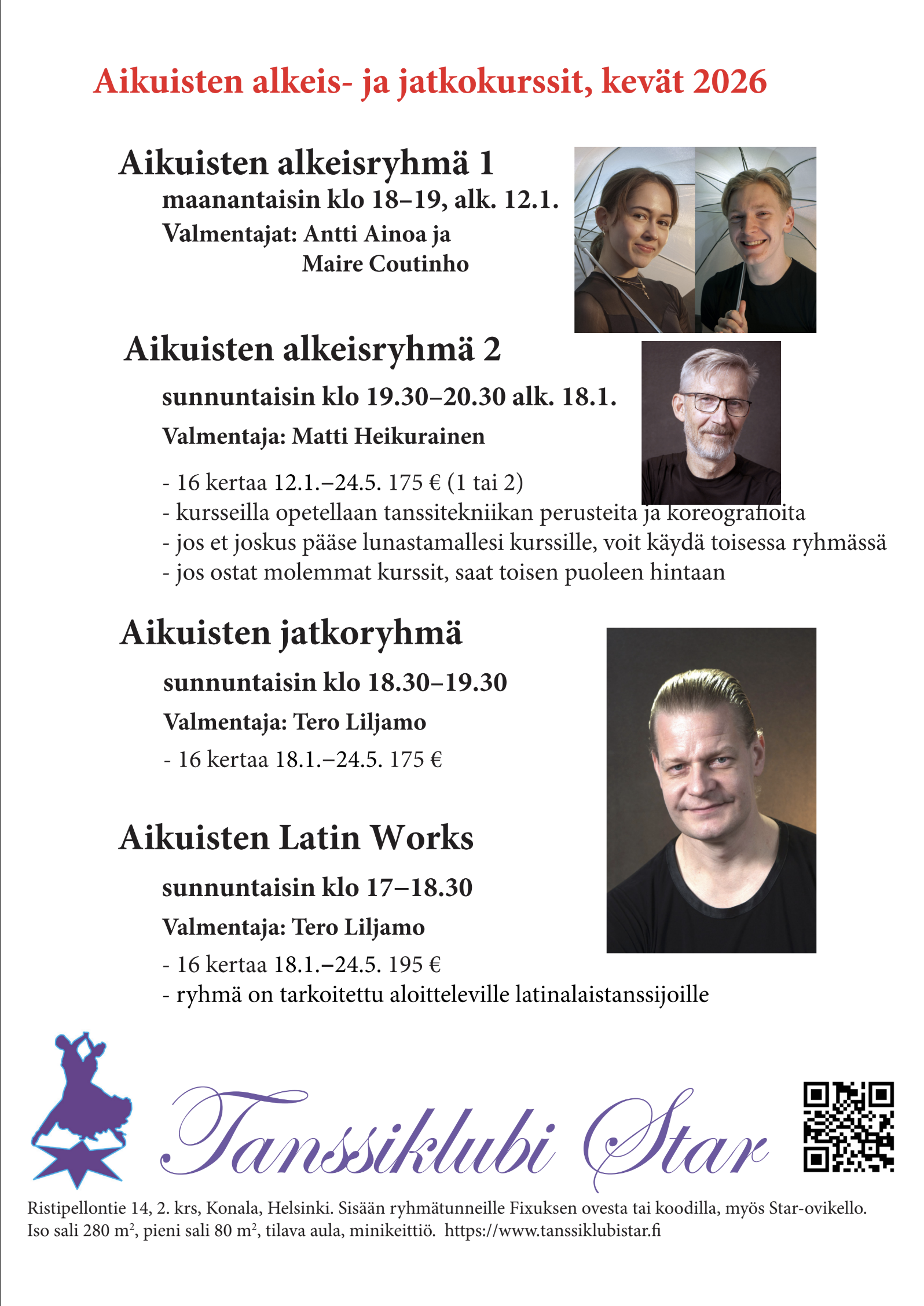 Latin Works; valmentajana Tero Liljamo sunnuntaisin klo 17-18.30. Ryhmä sopii aloitteleville ja jo jonkin verran lattareita tanssineille.