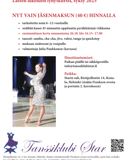 Lapsille, n. 6-12 vuotialle tarkoitettu lyhytkurssi. Kestää kuusi viikkoa ja harjoitukset kerran viikossa. Valmentajana Julia Pankkonen ja opeteltavia tansseja Samba, Chacha, Jive, Valssi, Tango ja Qiuckstep. Kurssi alkaa su 26.10.2025 klo 16.15.