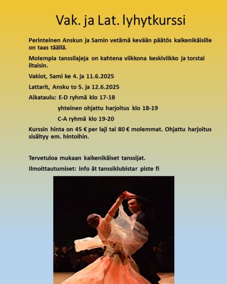 Aikuisille tarkoitettu alkeiskurssi, jossa opetellaan sekä vakiota että lattareita. Alkeiskurssi 1 maanantaisin klo 18 ja alkeiskurssi 2 sunnuntaisin klo 19.30. Valmentajina Antti Ainoa, Maire Coutinho ja Matti Heikurainen. Alkeiskurssin jatkoryhmä; valmentajana Tero Liljamo sunnuntaisin klo 18.30. Tällä kurssilla syvennetään peruskurssilla opittujen tanssien tekniikkaa ja koreografioita. Latin Works; valmentajana Tero Liljamo sunnuntaisin klo 17-18.30 (1,5 h). …