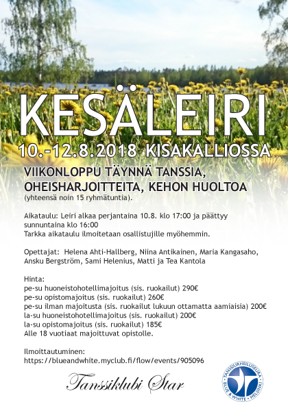 TanssiDans ry, Blue& White ry ja Star ry :n yhteinen leiri Kisakalliossa 12.-14.8.2022 Leirillä opettajina: Harri Antikainen, Niina Antikainen, Helena Ahti-Hallberg, Sami Helenius, Jutta Helenius ja Soile Näsänen Leirin aikataulu: Leiri alkaa perjantaina klo 16.00 ja loppuu sunnuntaina klo 16.00. Lauantaina on illanvietto mihin myös vanhemmat ovat tervetulleita. Tarkempi aikataulu leiristä lähetetään osallistujille myöhemmin. Alustavasti …