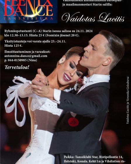 Feenix Dancen Anton Kurttila ja Nina Anderson järjestivät 23.-24.11.2024 Starin salilla vakiotanssien maailmanmestarin ja huippuopettajan Vaidotas Lacitiksen kaksipäiväisen opetussession yksityis- ja ryhmätunteineen, jolla oli kymmeniä osallistujia ympäri Etelä-Suomea. Vaidotas kehui Starin salia ja sen puitteita erinomaiseksi. Toivomme että saamme hänet tulemaan uudelleenkin.