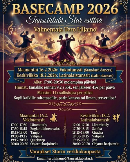Starin seuravalmentaja Tero Liljamo pitää kaksipäiväisen kaikille avoimen perusleirin salillamme vuoden 2026 viikolla 8. Tule mukaan maanantaina 16.2. ja keskiviikkona 18.2. syventymään vakio- ja latinalaistanssien perusteisiin. Leirin fokus & filosofia Tavoitteena on tunnistaa oman tekemisen kautta liikekieltä eri tansseissa – valssi, tango, quickstep, samba, chacha ja jive – ja muodostaa henkilökohtaisesti hyvä näkemys laadukkaasta perusliikkeestä …