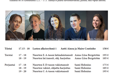 Ohjelmassa vakio- ja latinalaistanssikursseja lapsille, nuorille ja aikuisille. Lapsille alkeiskursseja tiistaisin ja sunnuntaisin, nuorille torstaisin ja perjantaisin ja aikuisille/nuorille maanantaisin, keskiviikkoisin ja sunnuntaisin.