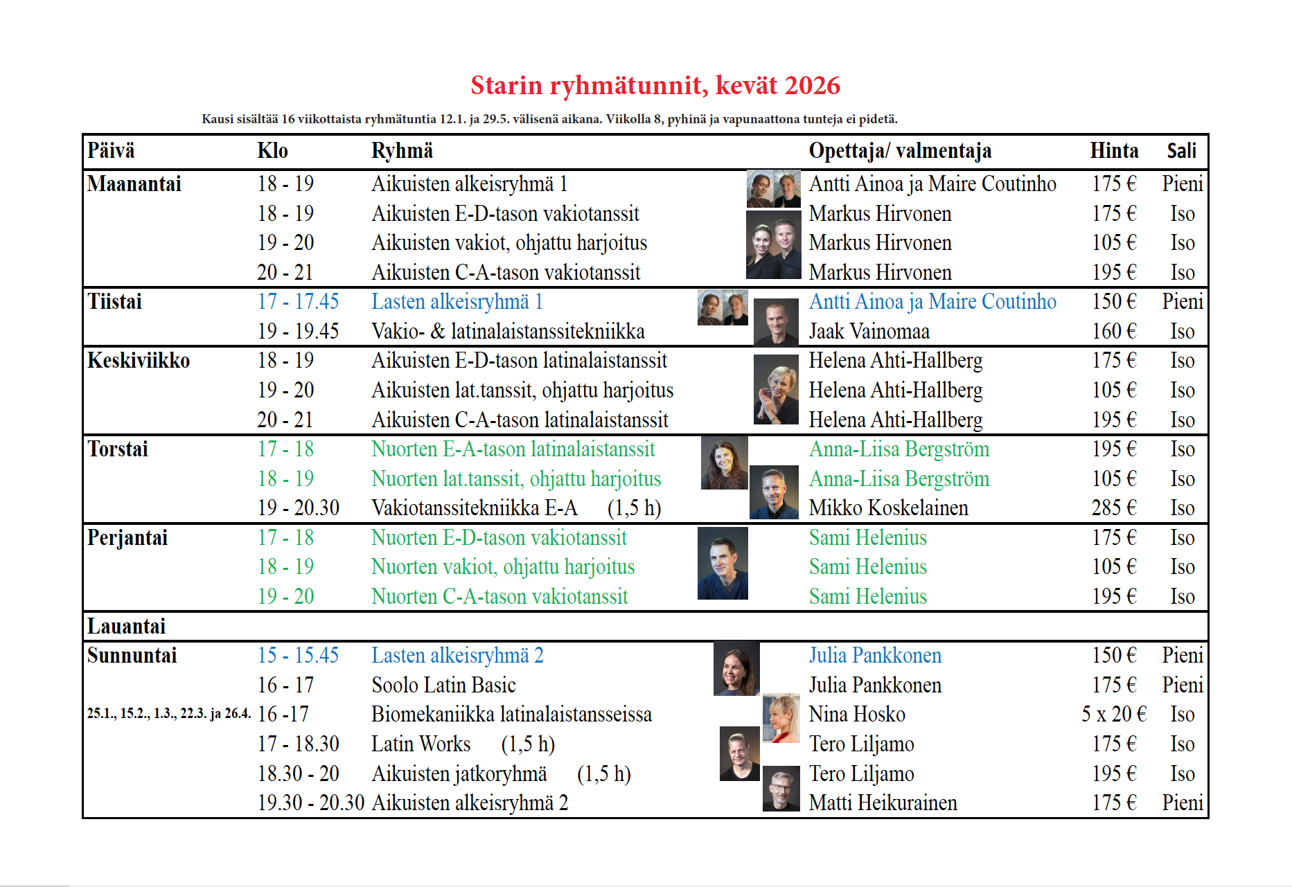 Kevätkausi alkaa ma 12.1. ja päättyy, kun ryhmiä on pidetty 16 kertaa. Hiihtolomaviikolla 8 ei ole ryhmiä. Muista mahdollisista poikkeuksista ilmoittavat opettajat kullekin ryhmälle erikseen ja poikkeukset näkyvät myös salikalenterissa.