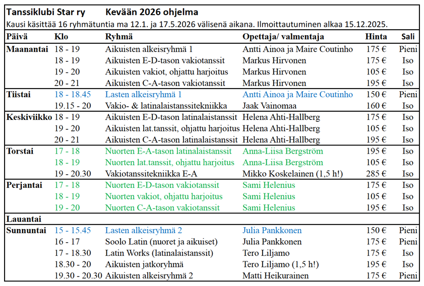 Kevään 2026 kausi alkaa maanantaina 12.1. ja päättyy 24.5. sisältäen 16 viikottaista opetuskertaa. Ryhmätunteja ei pidetä talvilomaviikolla. Viikko-ohjelma tiedotteen lopussa. Siihen saattaa tulla pieniä muutoksia ja mahdollisista muutoksista tiedotetaan heti.