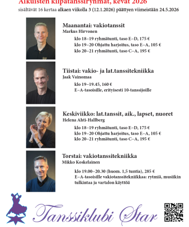 Syyskauden ryhmiin voi nyt ilmoittautua ja kannattaakin, koska varmasti toteutuvat ne ryhmät, joihin on riittävästi tulijoita. Klikkaa ylärivin ”Ilmoittaudu kursseille” ja täytä yläosan henkilötiedot sekä rastita haluamasi ryhmä. Tervetuloa tanssimaan.