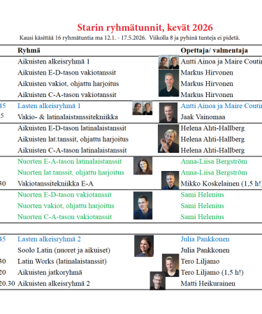 Tervetuloa kevään 2020 tanssikursseille, klikkaa tästä ilmoittautumislomakkeelle. Kilpatanssin alkeisryhmät, jatkoryhmät ja E-tason ryhmät soveltuvat erinomaisesti myös tanssijoille jotka haluavat oppia tanssimaan vaikka ilman kilpailutavoitteita. allaolevien ryhmien lisäksi meillä jatkaa kilpatanssin jatkoryhmät, tekniikkaryhmät ja tasoryhmät ohjelmiston mukaisesti, katso koko kurssitarjontamme tästä. Kurssikalenteri ja viikko-ohjelma Kevätkaudella Starissa alkaa ryhmiä seuraavasti : Maanantaisin : Alkeisryhmä …