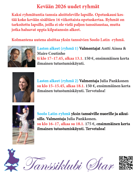 Lasten alkeiskurssit vakio- ja latinalaistanseista ovat tarjolla tiistaisin ja sunnuntaisin. Lisäksi nuorille ja aikuisille tarjolla Soolo Latin sunnuntaisin.