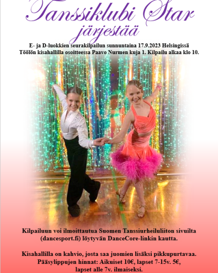 Tanssiklubi Star ry järjestää seurakilpailun sunnuntaina 17.9.2023 Helsingissä Töölön kisahallilla osoitteessa Paavo Nurmen kuja 1. Kilpailu alkaa klo 10 ja luvassa on tanssia kaikissa E- ja D-luokissa Lapsi 1:stä Seniori 4:iin. Kilpailuun voi ilmoittautua normaalisti Suomen Tanssiurheiluliiton sivuilta (dancesport.fi) löytyvän DanceCore-linkin kautta. Ilmoittautumisajan jälkeen jälki-ilmoittautumisia otetaan, mikäli se ei aiheuta muutoksia aikatauluun. Katso tarkemmat tiedot …