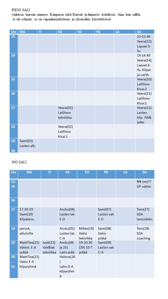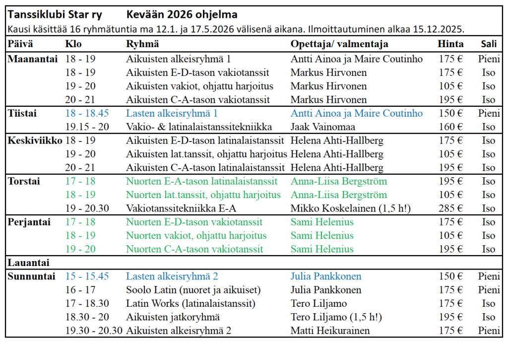 Kunkin kuukauden ryhmä- ja muut tunnit näet oikean freimin kalentereista (iso sali ja pieni sali sen alapuolella). Kevään ohjelman julkaisun jälkeen siihen saattaa tulla vielä muutoksia. Tarkemmat ajat kullekin ryhmälle näet kohdasta ”Kurssit ja hinnat”. Ohjelma noudattelee pitkälti syksyn 2025 ohjelmaa. Kaikki ryhmät ovat omalla salilla Konalassa. Lasten alkeisryhmiä on tarjolla kaksi vaihtoehtoista aikaa, samoin aikuisten peruskurssia. Uutena tarjoamme Soolo Latin ryhmää sunnuntaisin.